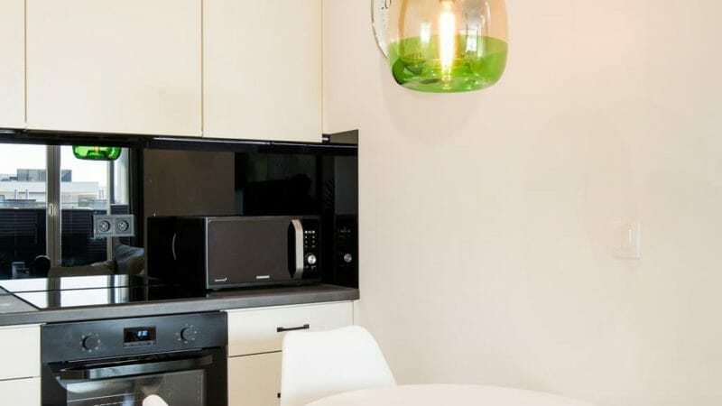 O mare atenție a fost acordată spațiilor de depozitare. Imediat lângă intrarea în apartament este un dulap înalt, până la tavan, cu uși-oglindă. Și mobilierul din bucătărie ajunge la plafon, iar backsplash-ul este negru-oglindă ce reflectă parte din lumina livingului.