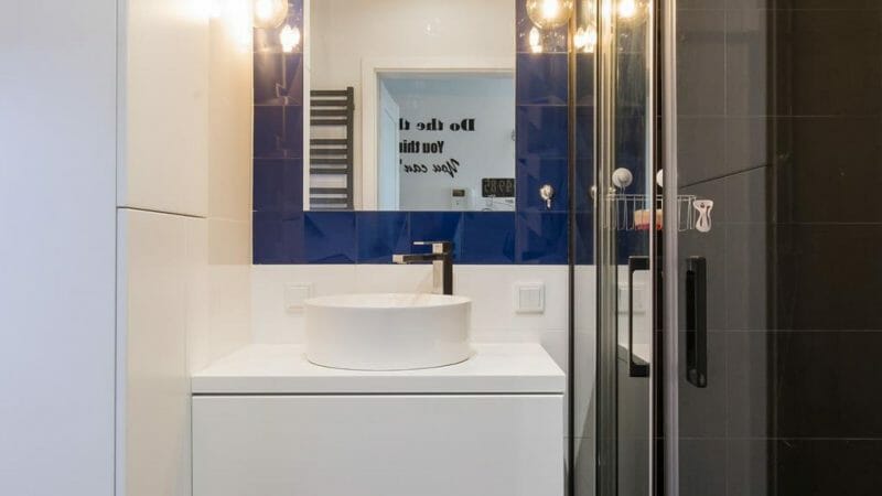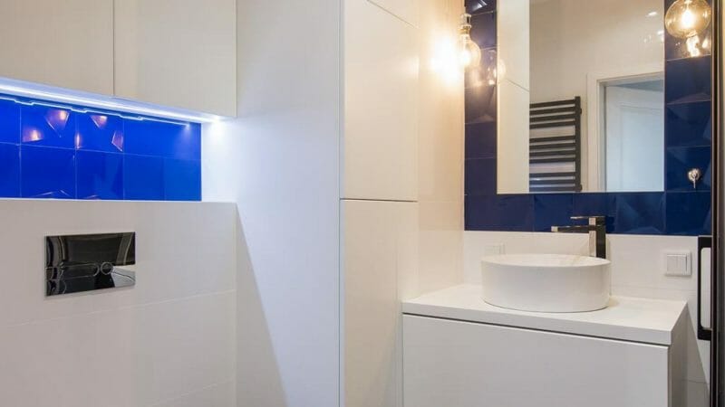 Baia este simplă, modernă, iar accentele albastre o scot din anonimat. Și aici regăsim spații de depozitare pe perete și am remarcat lampa led ce evidențiază nișa de deasupra toaletei. O idee foarte interesantă și de mare efect.