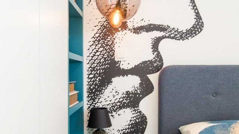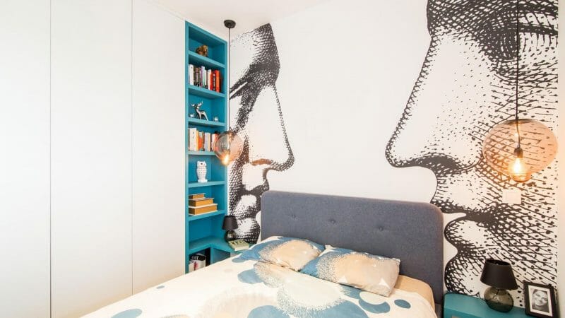 Dormitorul este dominat de dulapuri: albe, până la tavan, aproape se confundă cu pereții. Ce ne atrage atenția este raftul turcoise și, bineînțeles, peretele artistic decorat de la capul patului.