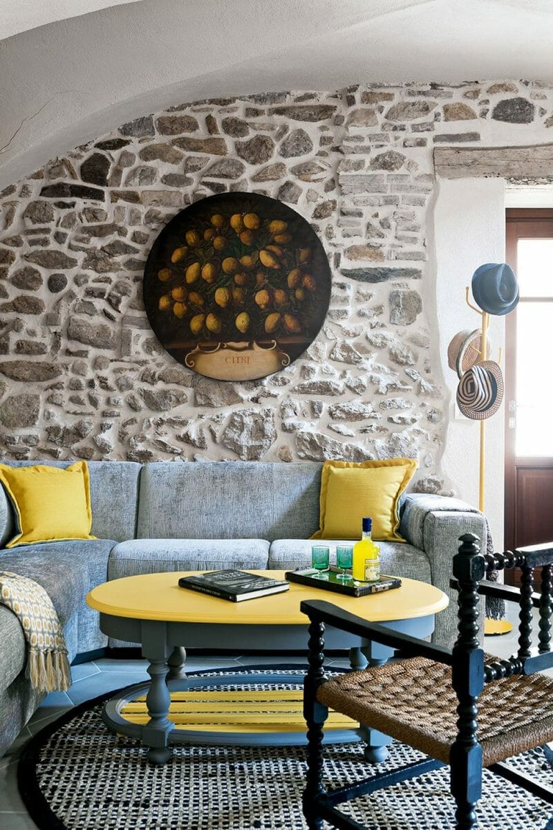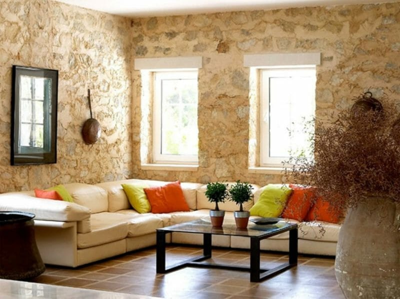 Adăugaţi accente de culoare strălucitoare în nuanţele culorilor galben, portocaliu şi roşu. Ele vor face ca peretele de piatră să se evidenţieze într-un mod foarte spectaculos.