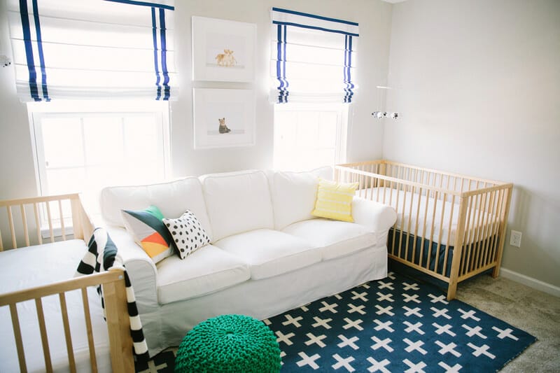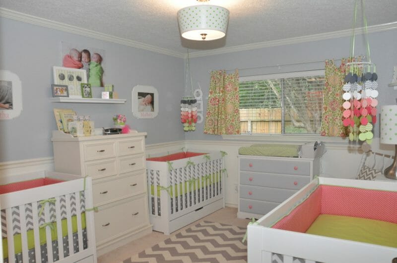 În cazul camerelor pentru gemeni sau tripleți, puteți opta pentru aranjarea pătuțurilor unul lângă altul, dar cu spațiu de trecere, astfel încât mămica să-și poată luă bebelușii cât mai ușor, puteți alege varianta în linie (cap la cap) sau pe o parte și pe alta a camerei, dacă spațiul acesteia vă permite.