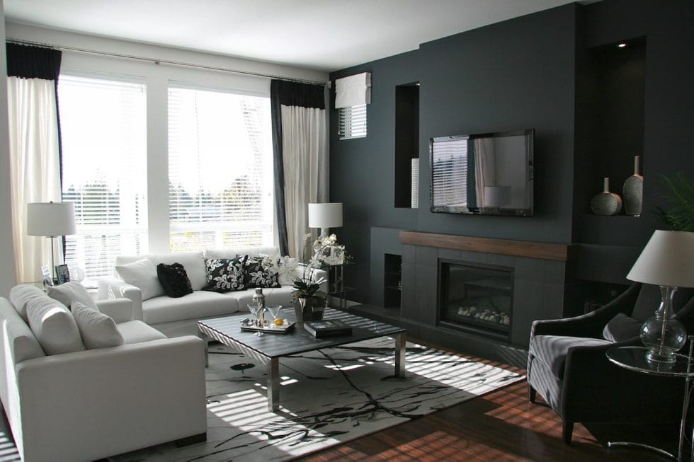 Un perete negru sau gri foarte închis este suficient pentru a aduce o cameră în centrul atenției, fără a suprasolicita spațiul. Bonus: Dacă vopsiți peretele din spatele ecranului plat într-o nuanță foarte întunecată, aceasta va face televizorul pur și simplu să dispară și să pară mai mare.