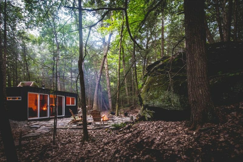Dacă nu doriţi să vă angajaţi pe deplin în construcţia unei locuinţe din containere, puteţi închiria această cabină confortabilă, situată în Munţii Catskills, pentru 195 de dolari pe noapte. Construită dintr-un container de transport de numai şase metri, este amplasată pe un teren de 80 de metri pătraţi şi include o sobă pe lemne, o canapea extensibilă, o chicinetă şi un birou de scris, printre alte facilităţi moderne.