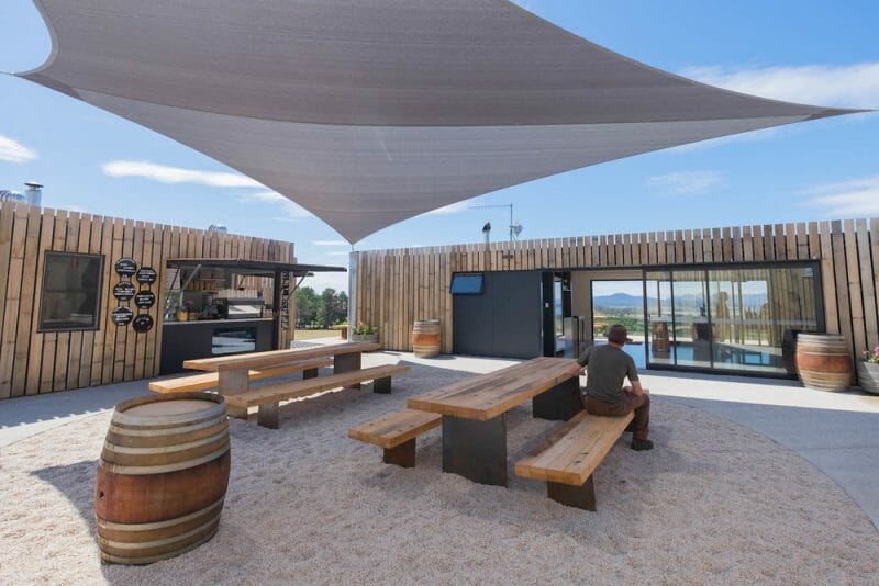 O serie de containere de transport maritim placate cu lemn înconjoară o terasă în aer liber, unde oaspeţii pot admira peisajul şi pot savura cele mai nobile vinuri din Tasmania.