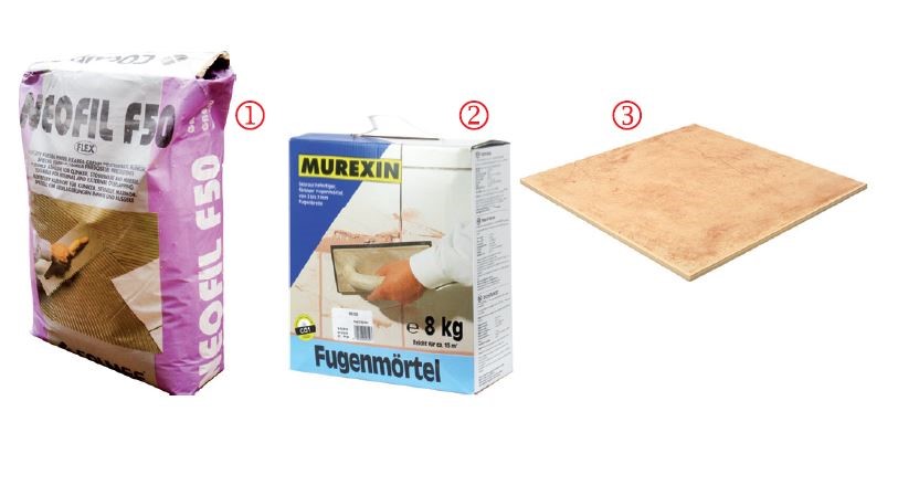 1. mortar-adeziv, 2. chit de rost, 3. plăci ceramice