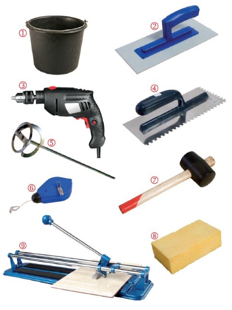 1. găleată plastic, 2. racletă, 3. bormaşină, 4. drişcă zimţată, 5. accesoriu pentru amestecat, 6. fir de trasat, 7. ciocan din cauciuc, 8. burete, 9. aparat de tăiat plăci ceramice.