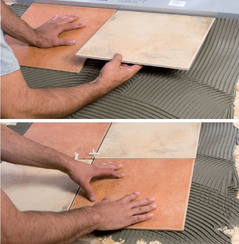 Pentru a obţine o dispunere cât mai eficientă, se pot aşeza plăcile pe uscat, verificând astfel poziţionarea lor faţă de pereţii camerei.