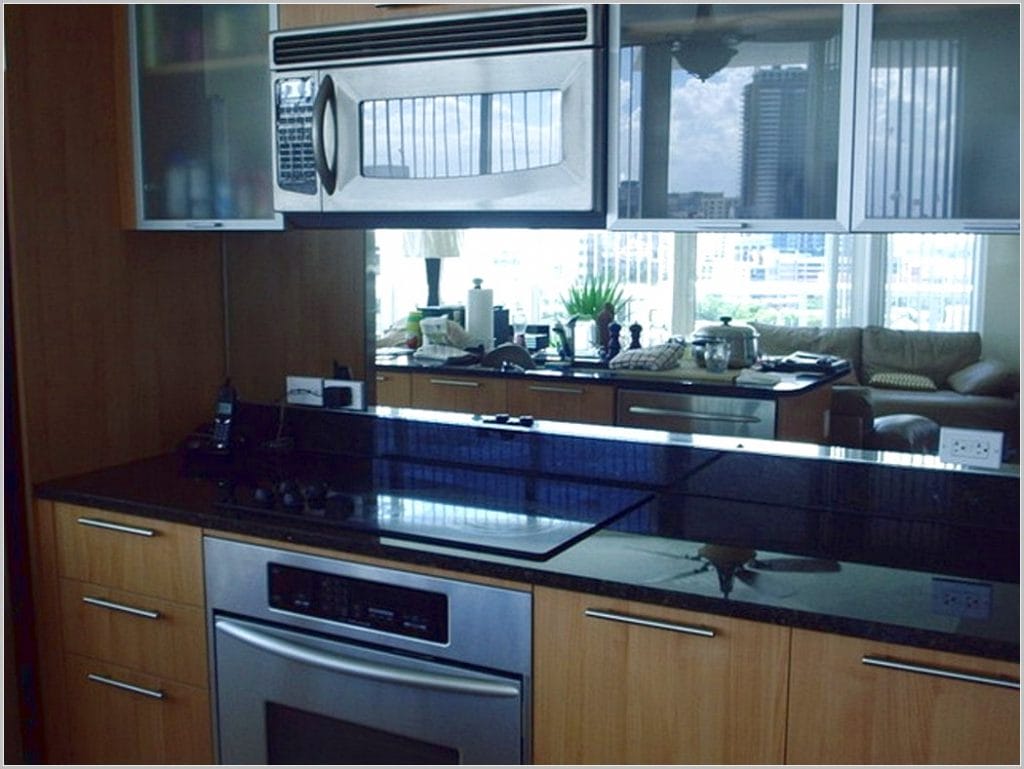 O să spuneţi, cum oglindă în bucătărie!? Da, da o oglindă plasată strategic face minuni atunci când vine vorba de a crea iluzia de spaţiu într-o cameră strâmtă, ajutând totodată la alungirea vizibilă a pereților. O modalitate simplă este de a trasforma această suprafață reflectorizantă în plintă (ştiţi voi, acele piese mici din lemn, piatră, mozaic sau din material plastic care se aplică la partea de jos a pereților unei încăperi pentru a-i apăra împotriva loviturilor și a umezelii sau pentru a acoperi rostul dintre pardoseală și perete) – un truc de design mai necinstit, dar extrem de eficient pentru utilizarea acestei zone compacte de gătit.