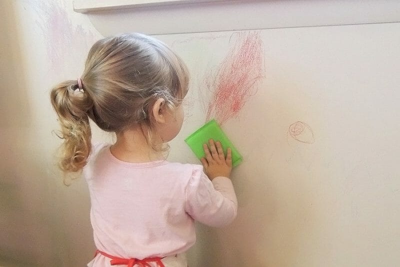 Folosind o cârpă umedă, moale şi un pic de săpun sau un produs cum ar fi Magic Sponge, ştergeţi urmele de carioci, creioane colorate, sau cele de uzură. Umpleţi toate micile găuri din perete şi aplicaţi un strat de vopsea în locul respectiv.